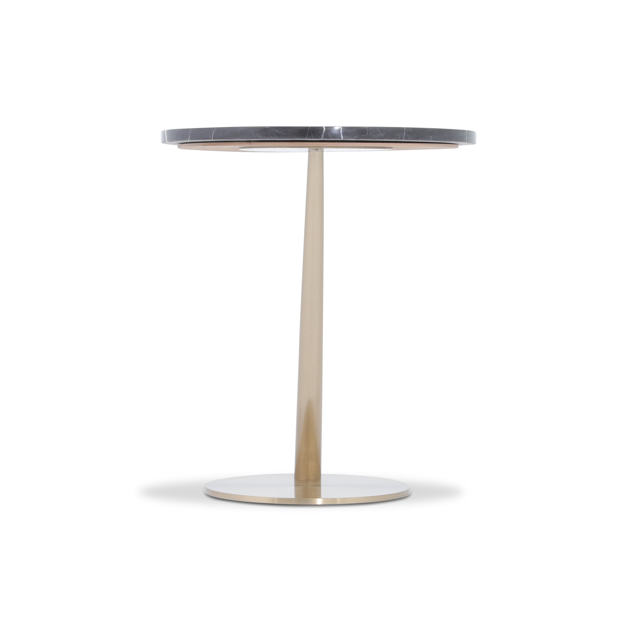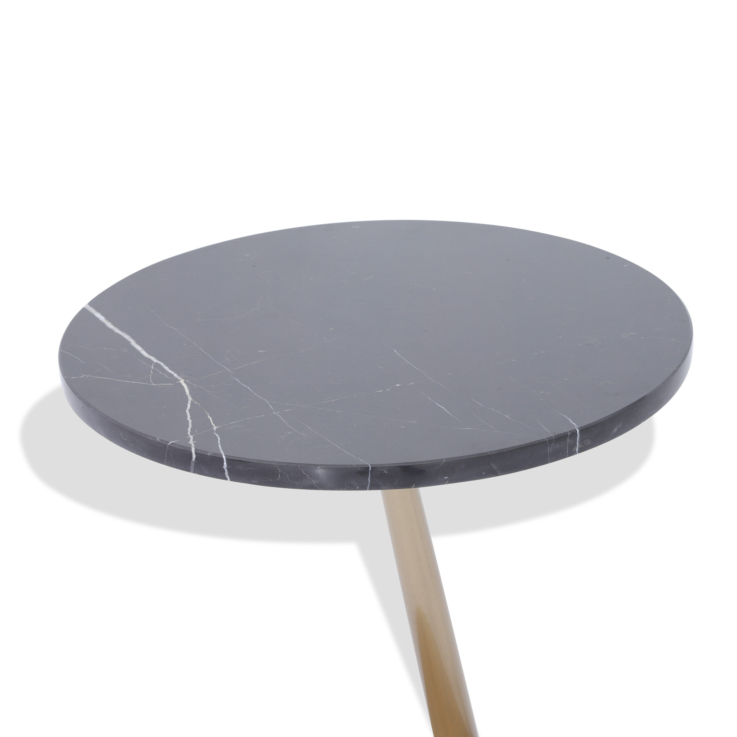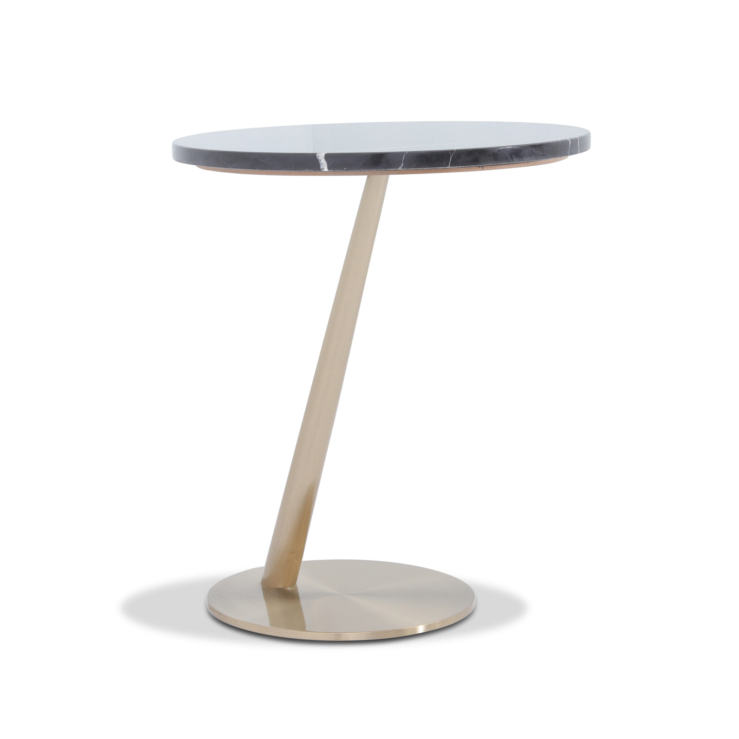 This Brassica coffee table features a striking oblique, tubular brass leg that seamlessly connects the round base to the elegant circular top, crafted from premium tendra grey marble. Its design blends modern sophistication with natural beauty, making it an exceptional addition to any space.